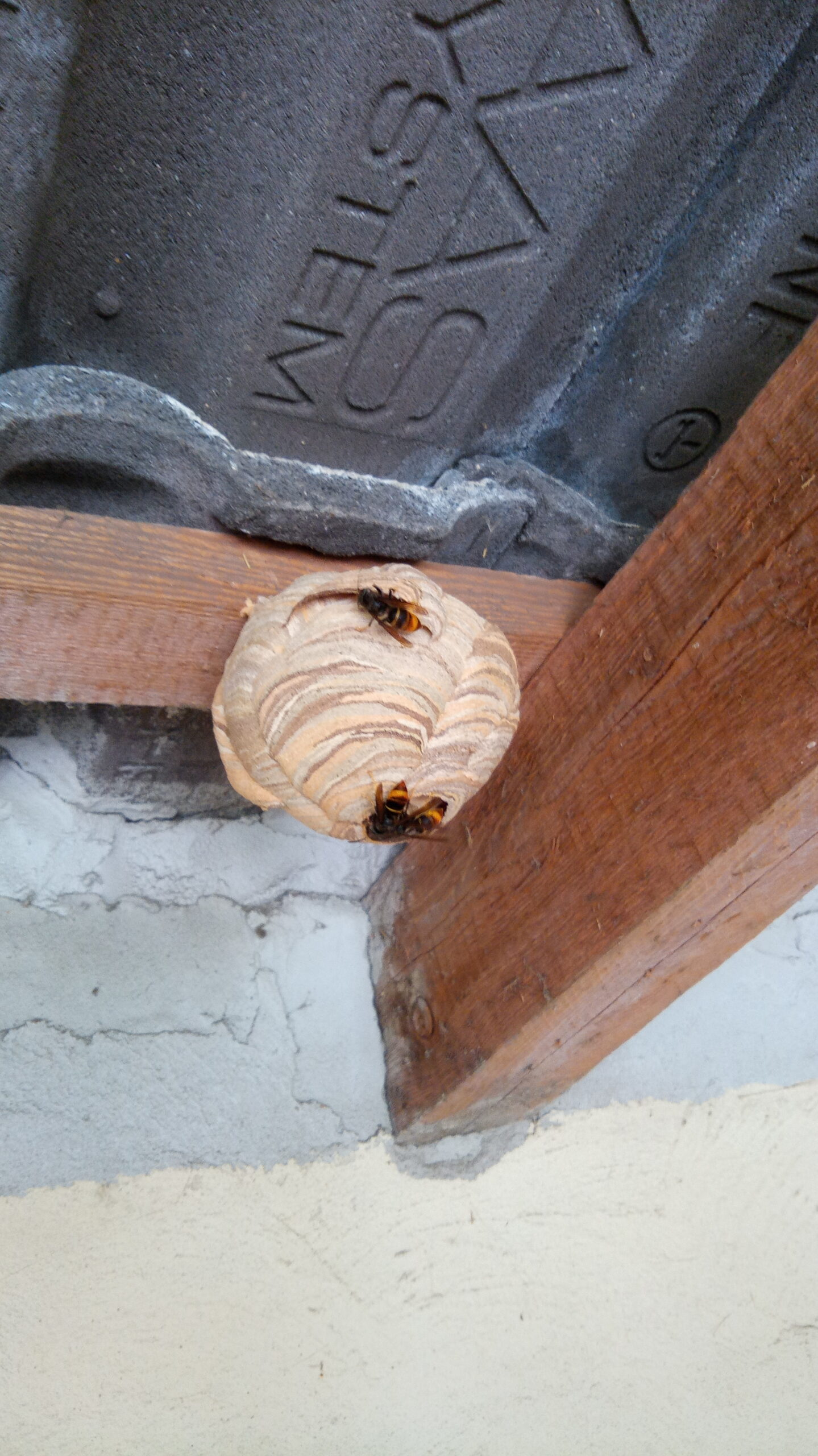 Hallo, wir haben in unserem Fahrradschuppen ein Hornissennest gesichtet. Es ist etwa faustgroß und wird gerade aktiv ausgebaut. Es sind immer 4-5 Tiere aktiv (außerhalb) und im Inneren bewegt sich auch einiges. Von der Größe und Farbe ist es eindeutig die Velutina.
